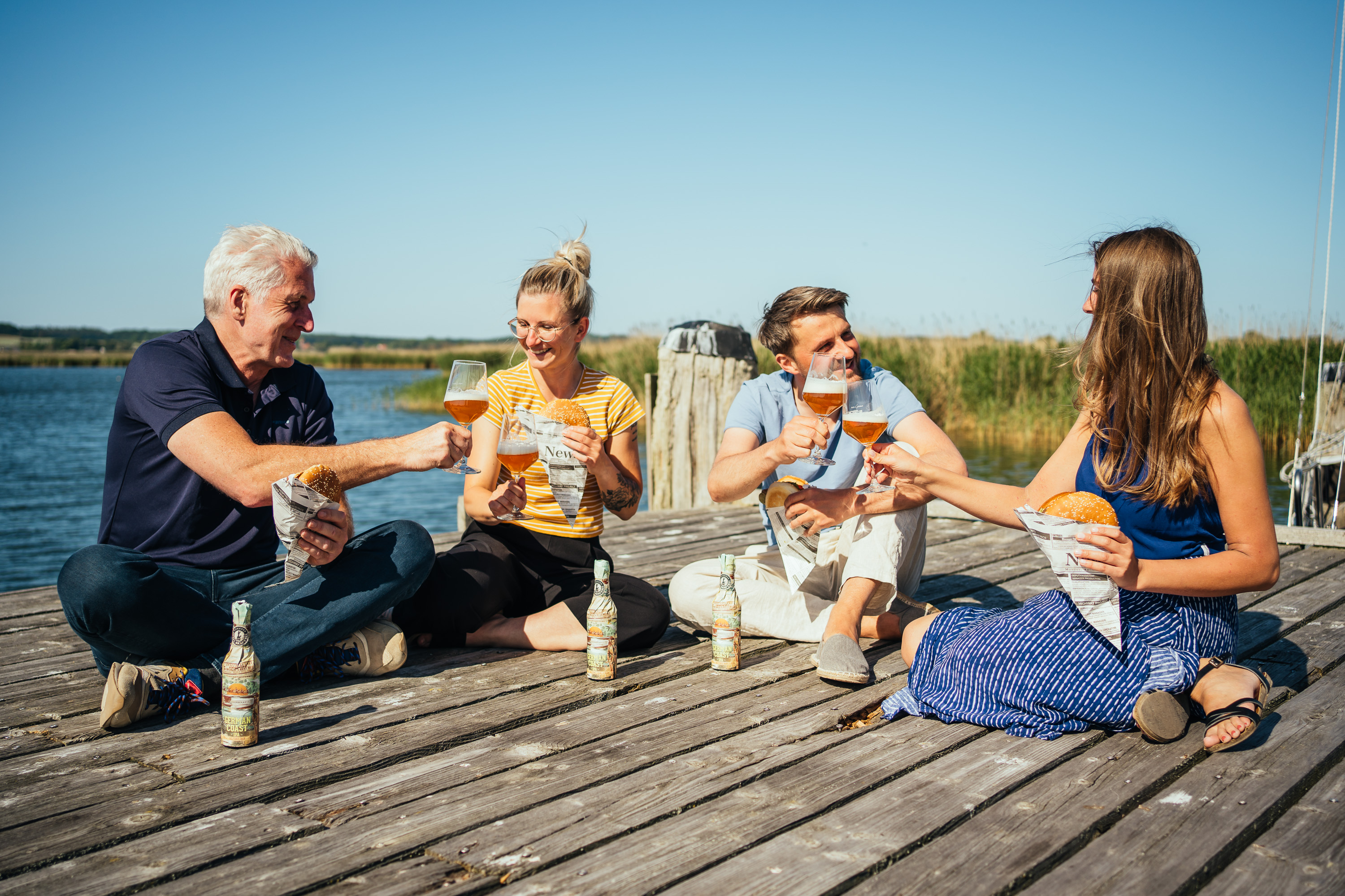 Sattes Gold leuchtet im Glas, gekrönt von einer feinporigen Schaumkrone. Die deutsche Hopfensorte Magnum ergibt im Verbund mit der Reifung auf Kiefernzapfen und Nadelzweigen eine genussvoll durstlöschende Frische mit der appetitlich harzigen Würzigkeit des Küstenwaldes. Trocken, herb, nordisch-kantig und ostsee-frisch